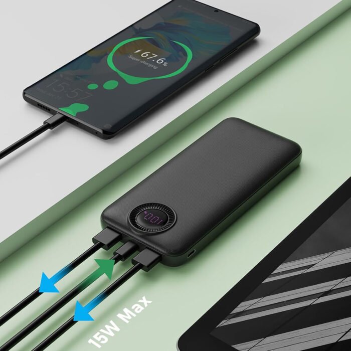 - Dual Outputs & Inputs: With 2 outputs (2.4A, 2 USB-A) and 2 inputs (USB-C + Micro USB) , this power bank allows you to charge two devices simultaneously. The fast charging capability reaches up to 2.4A, ensuring all your devices are charged quickly and efficiently, no matter the combination.