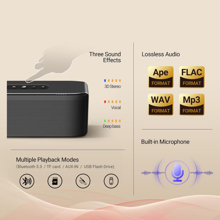 • Stable Connection: Utilizing advanced Bluetooth 5.3 technology, this speaker ensures a faster and more stable connection within a range of up to 60 feet. Enjoy seamless compatibility with your smartphone, TV, computer, and more in seconds. Additionally, the speaker supports TF cards, USB flash drives, and AUX input, providing versatile playback options for your convenience.