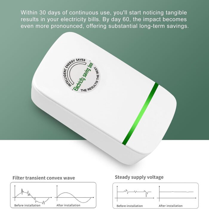 • Simply plug the power factor saver into an electrical outlet, and the green indicator light will illuminate, indicating it is operational.